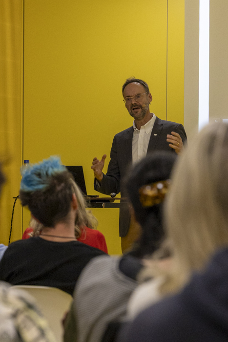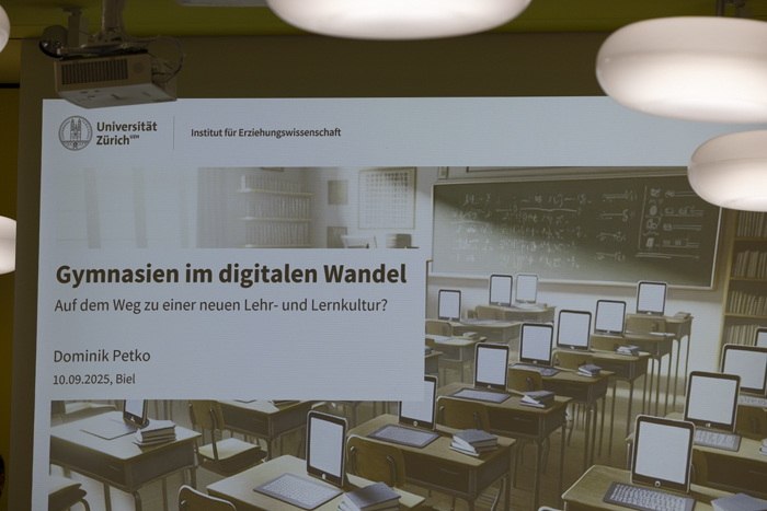 Herr Prof. Dr. Dominik Petko (Professor Professor für Allgemeine Didaktik und Mediendidaktik an der Universität Zürich) sprach in seinem Input darüber, wie die digitale Transformation an den Gymnasien sinnvoll umgesetzt werden kann. Er plädierte für einen überlegten Ansatz, bei welchem die Schüler:innen nicht einfach passiv zusätzliche digitale Medien benötigen, sondern dafür, den Unterricht und Prüfungssituationen neu zu denken und zu konzipieren.